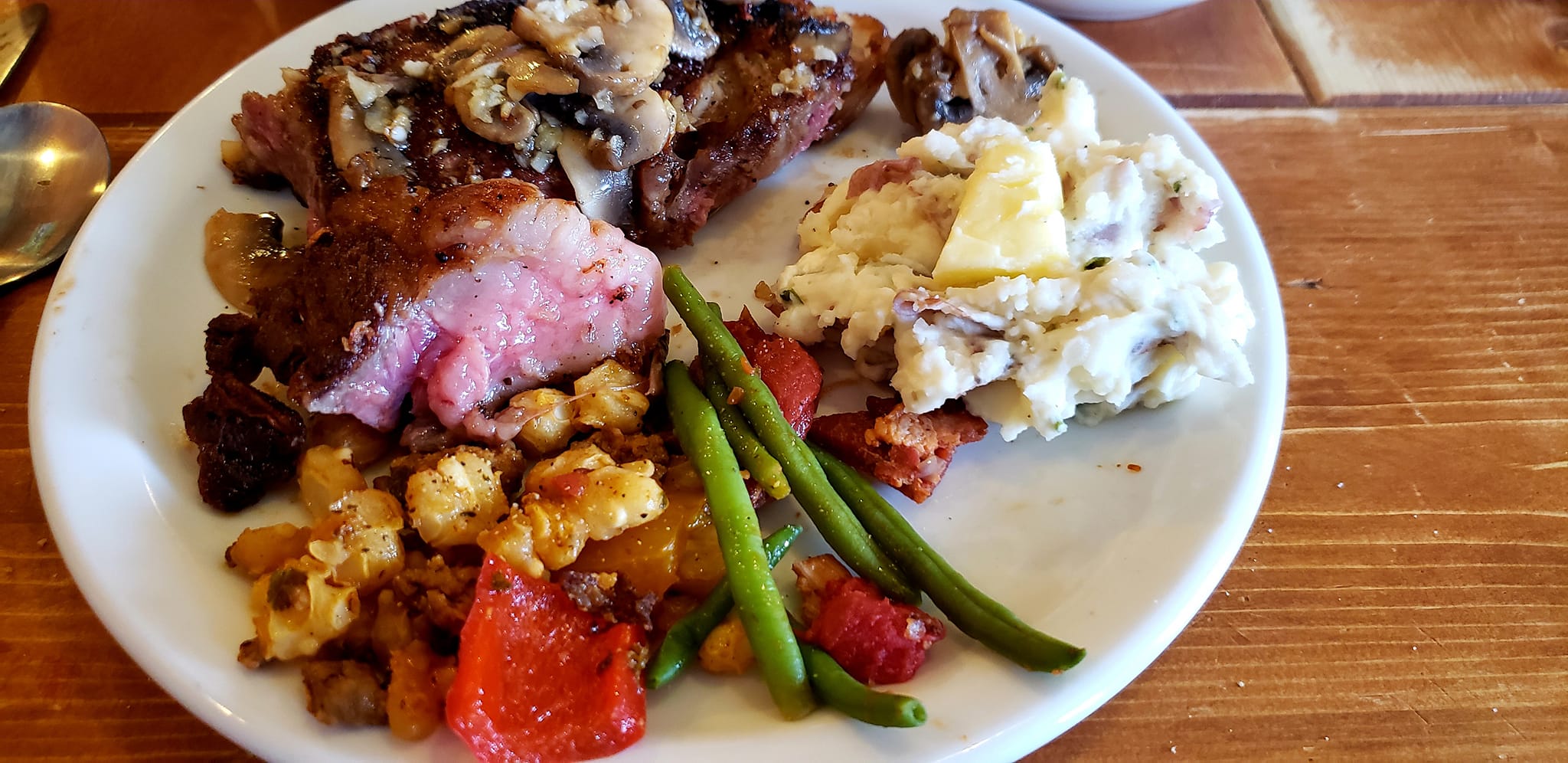 Not to worry too much because down the road on Rosedale Highway is my all-time favorite, Benji's. Here, you start off with the best salad I've had anywhere...a fresh selection from the garden with their delicious creamy vinegarette...vegetable soup, pickled tongue and jack cheese, pasta, bread and salsa, the vegetable dish, your choice of potatoes, the entree, then dessert.